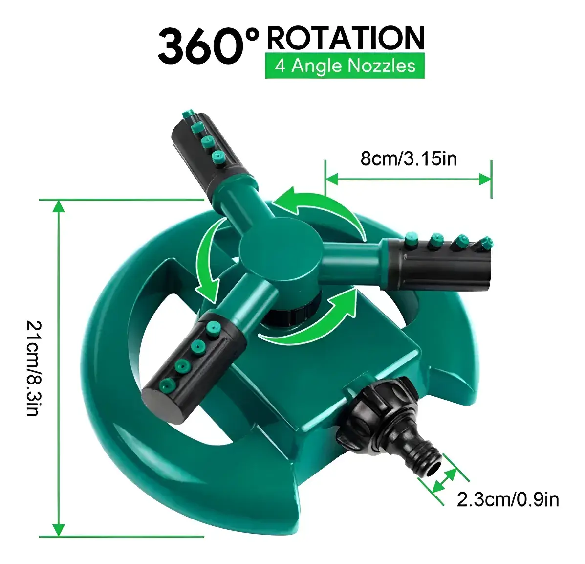 -Rotación de 360°: Cubre cada rincón de tu jardín con su rotación completa de 360 grados, asegurando un riego uniforme.