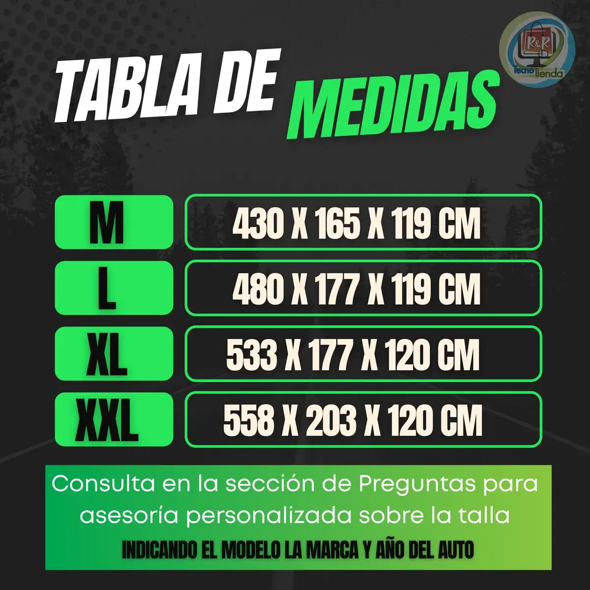 XL: 5.334m Largo X 1.778m Ancho X 1.168m Alto