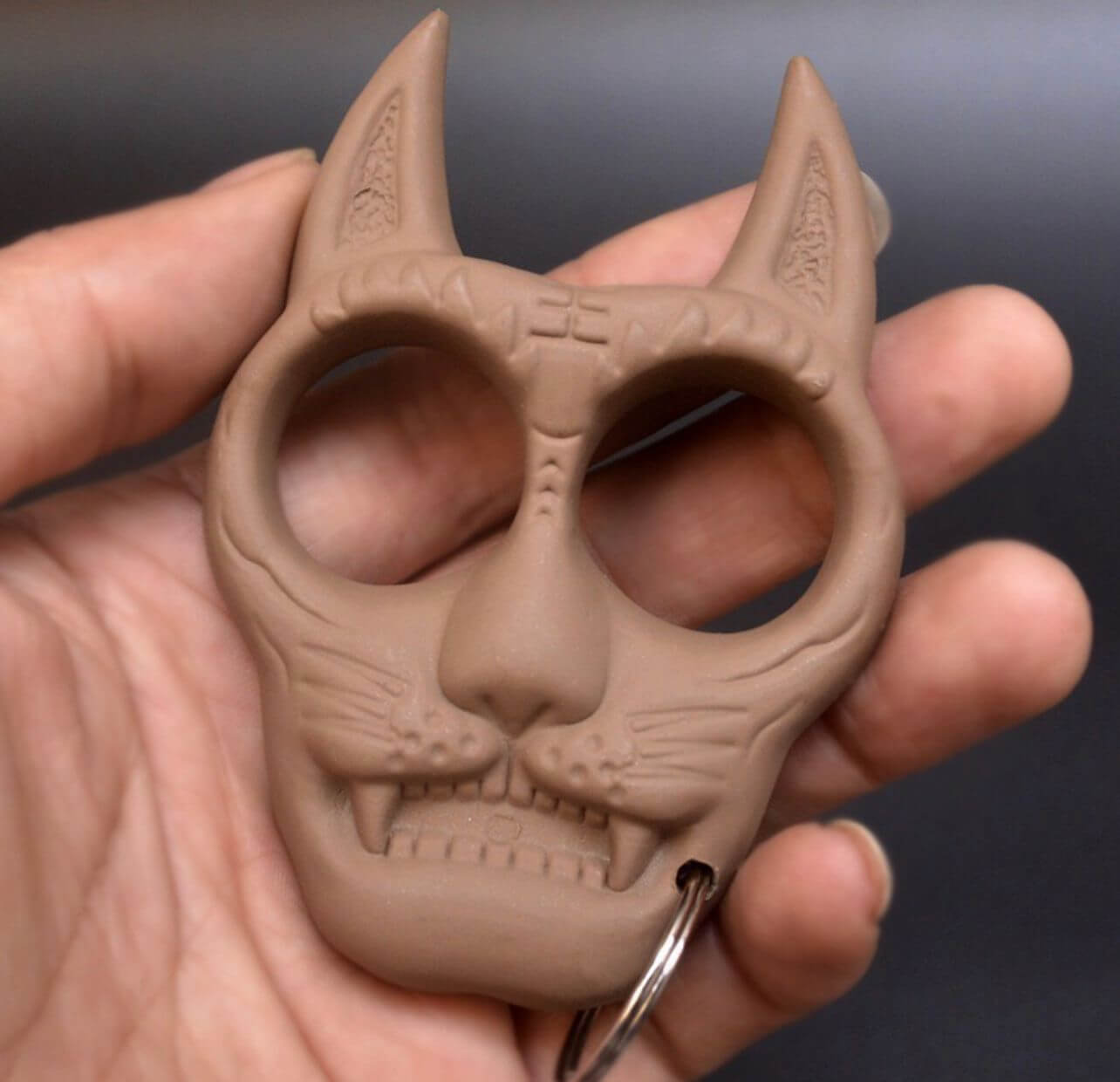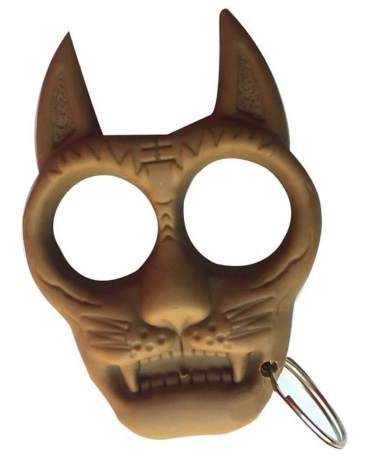 Espectacular manopla para defensa personal, está fabricada en plástico rígido fácil de empuñar. Es completamente indetectable, aparenta ser un inofensivo llavero con forma de Gato.