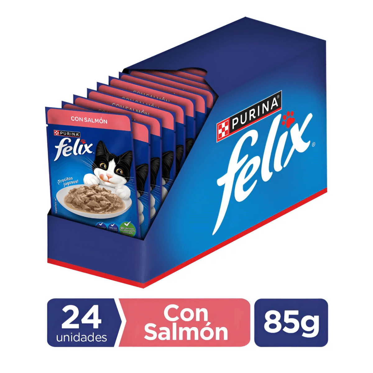 ¡Haz que tu gato disfrute al máximo! Agrega hoy mismo al carrito el Felix® Gato Adulto Salmón 85 g – Pack 24 Sobres y consiéntelo con lo mejor de Purina®.